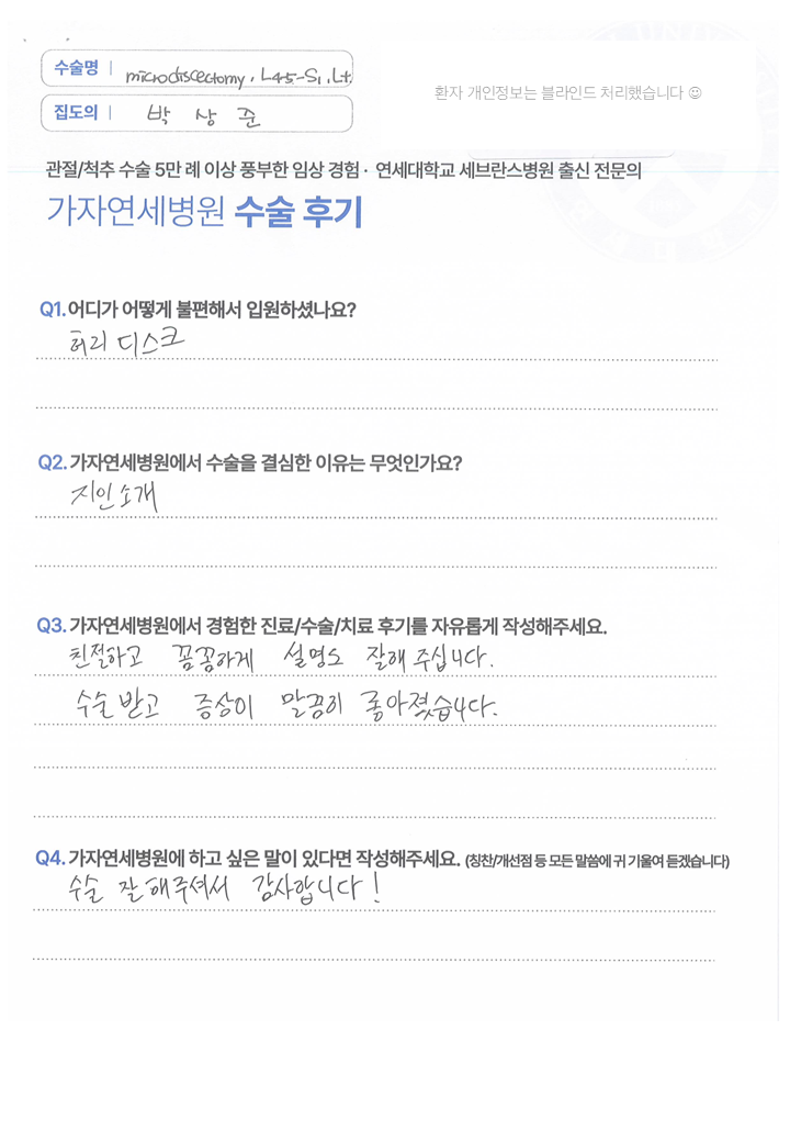 [목·허리클리닉] 척추정형외과 전문의 박상준 ㅣ 요추 4-5번, 천추 1번 미세현미경 추간판 절제술