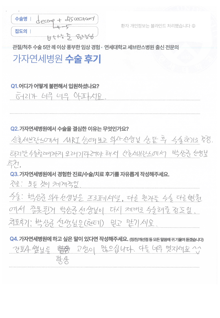 [목·허리클리닉] 척추정형외과 전문의 박상준 ㅣ 요추 4-5번 신경감압수술 및 추간판 절제술