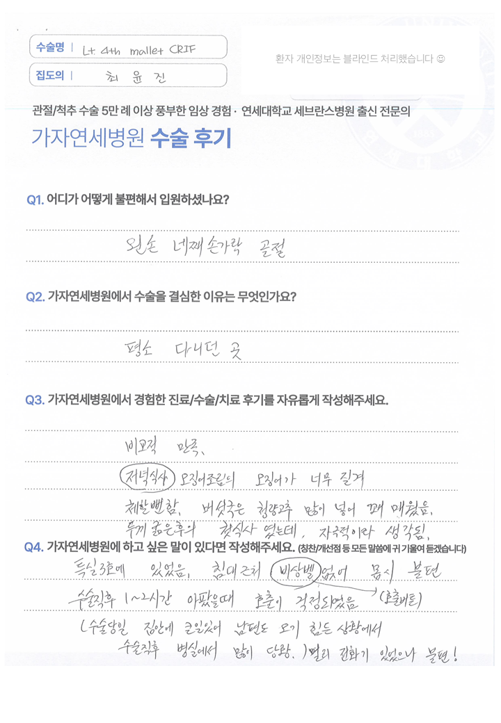 [손·손목·팔꿈치] 정형외과 전문의 최윤진 ㅣ 좌측 4번째 손가락 골절 폐쇄적 정복술 및 내고정술