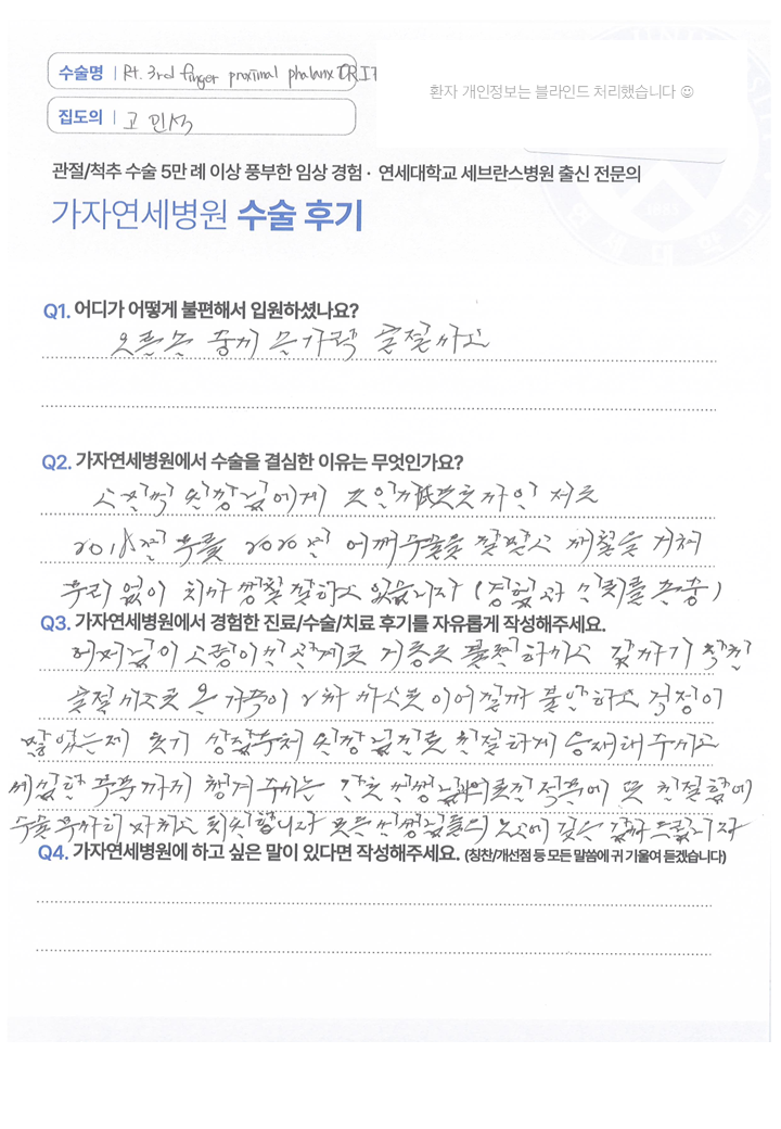 [손·손목·팔꿈치] 정형외과 전문의 고민석 ㅣ 우측 3번째 손가락 골절 개방적 정복술 및 내고정술