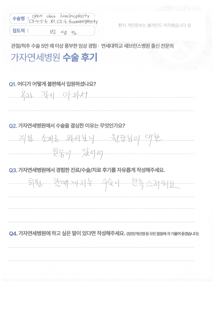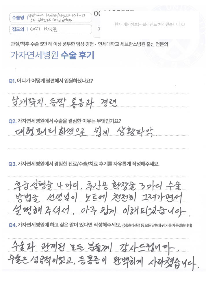 [목·허리클리닉] 척추정형외과 전문의 박상준 ㅣ 경추 3,4,5,6번 초음파 나이프 후궁성형술 및 경추 7번, 흉추 1번 유합술, 흉추 2,3번 신경감압수술 추간공 성형술