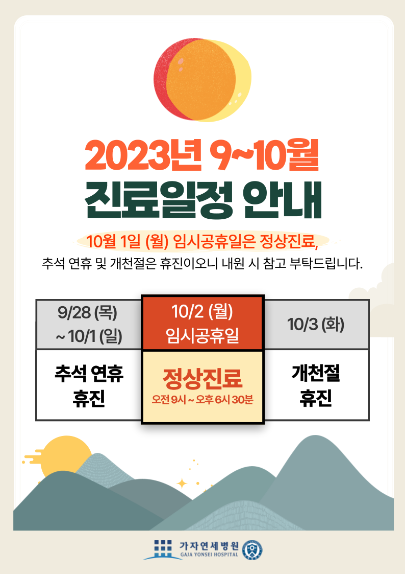2023년 9월 추석 연휴 및 10월 개천절 공휴일을 맞이하여 진료 일정을 알려드립니다.