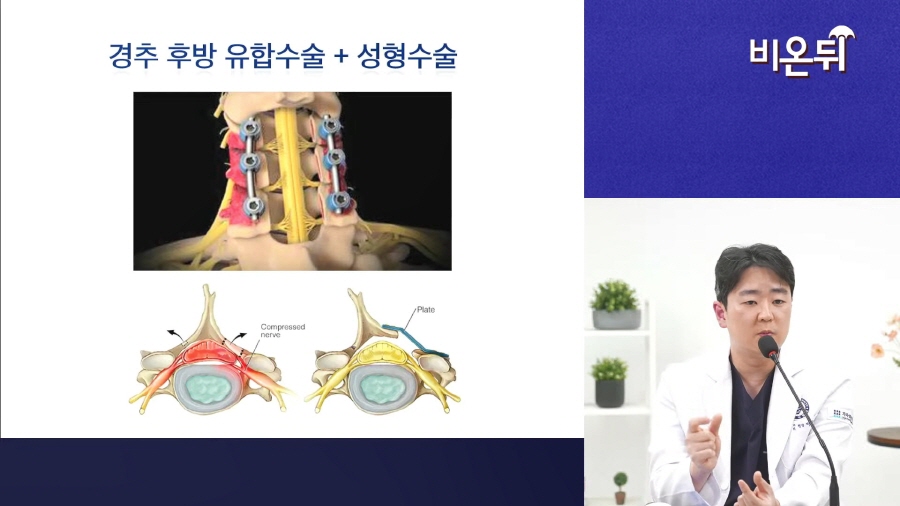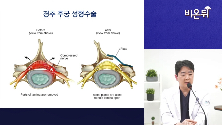 협착으로 척수를 누를 땐 경추 후궁 성형술로 신경을 압박하는 후궁을 열어주고 플레이트로 고정하는 치료를 통해 호전을 기대할 수 있습니다.