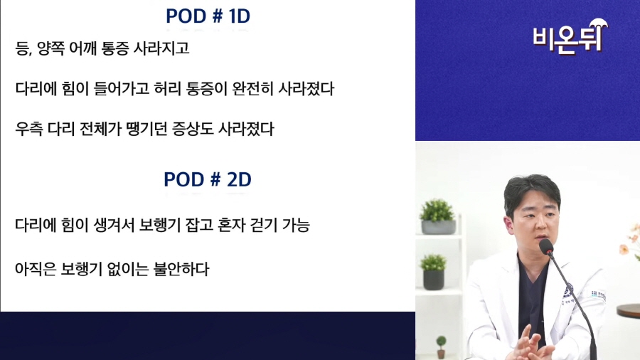수술 후 1일차 허리 통증이 완전히 사라지고 다리 전체가 당기던 증상도 해소, 수술 전 있었던 통증과 보행장애들이 모두 해결되었습니다.