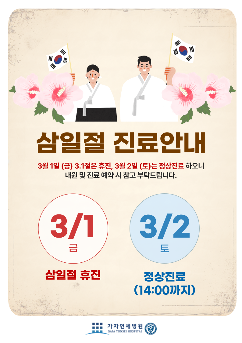 가자연세병원 삼일절 진료 안내 (3/2 토요일 14:00까지 진료)