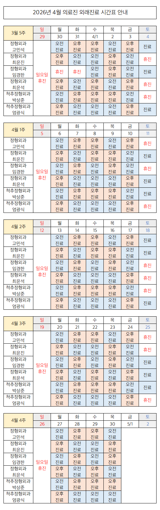 2026년 4월 의료진 외래 진료 시간표 (3/31 업데이트)