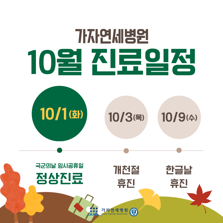 가자연세병원 10월 진료안내 (10/1 임시공휴일 정상진료)