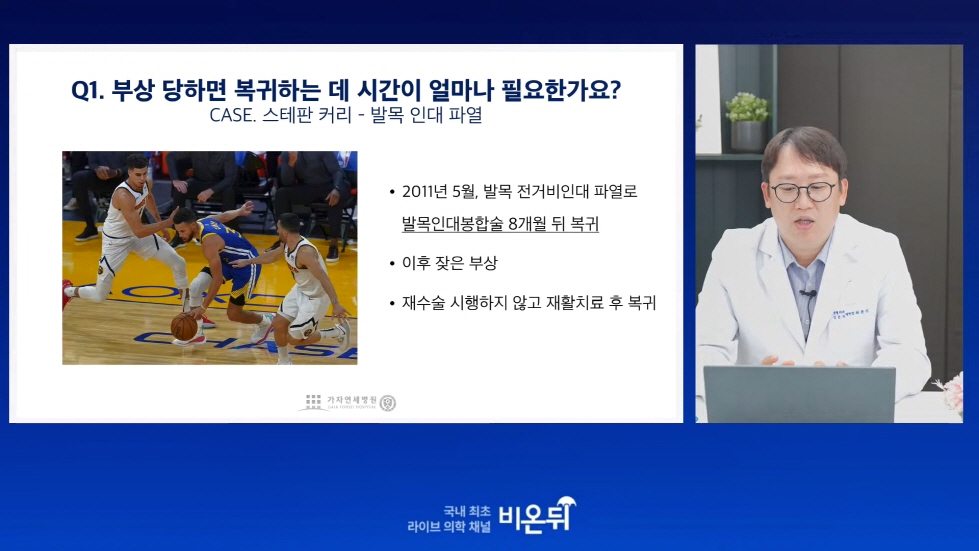 스테판 커리나 박지성 선수 등 유명한 선수들의 부상 사례와 실제 치료법을 설명해주시면서