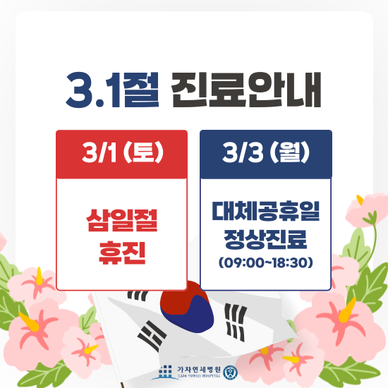 가자연세병원 3.1절 진료안내 (3/3 대체공휴일 정상진료)