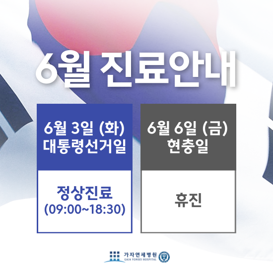 6월 제21대 대통령선거일 및 현충일 공휴일을 맞아 미리 진료 일정을 알려드립니다.