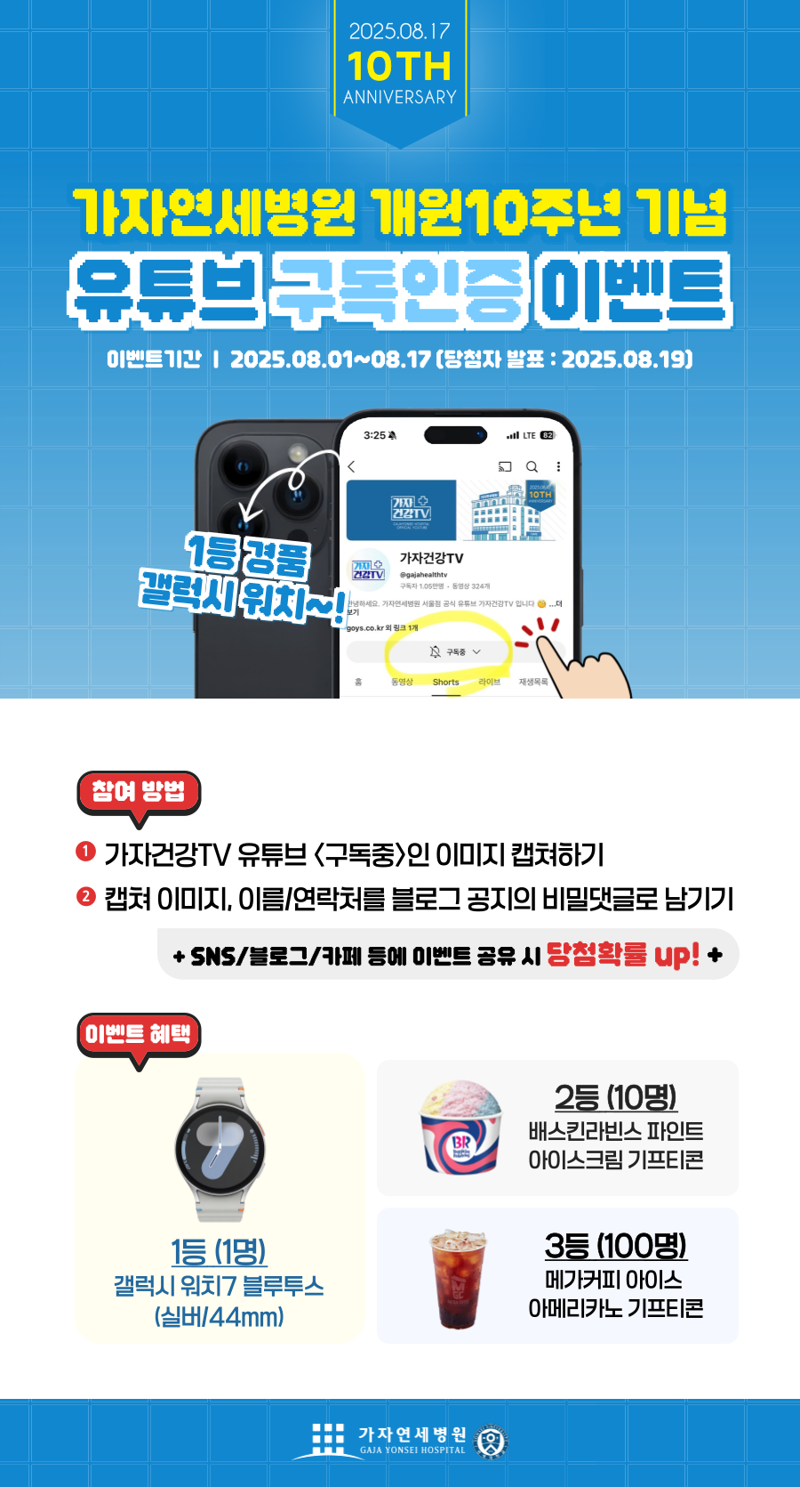 가자연세병원 개원 10주년 기념 유튜브 구독 인증 이벤트 (종료)