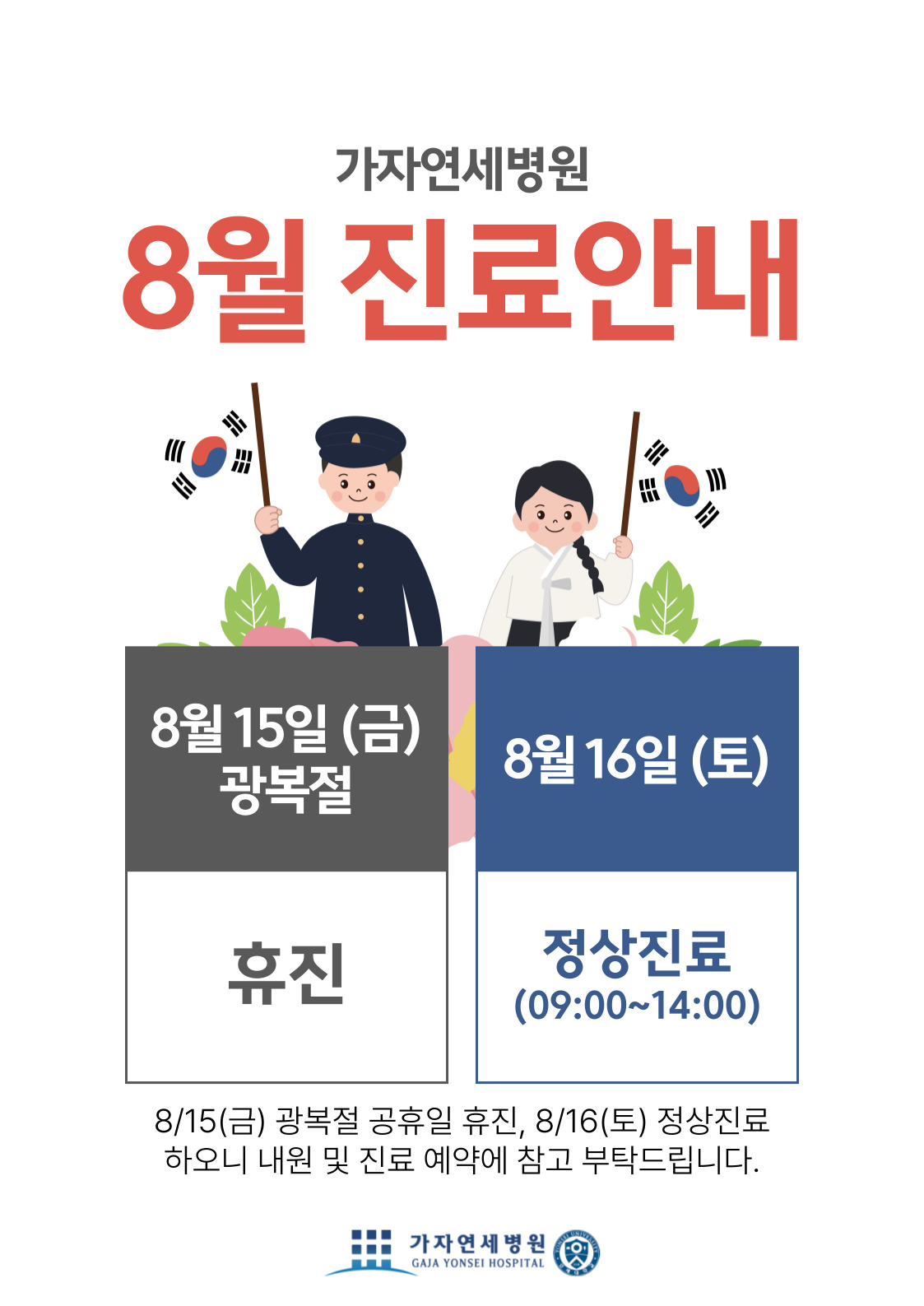 가자연세병원 8월 진료안내 (8/15 휴진)