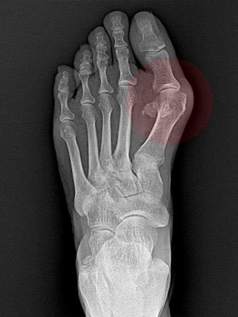 엄지발가락이 옆으로 심하게 휘어 둘째 발가락과 맞닿는다.