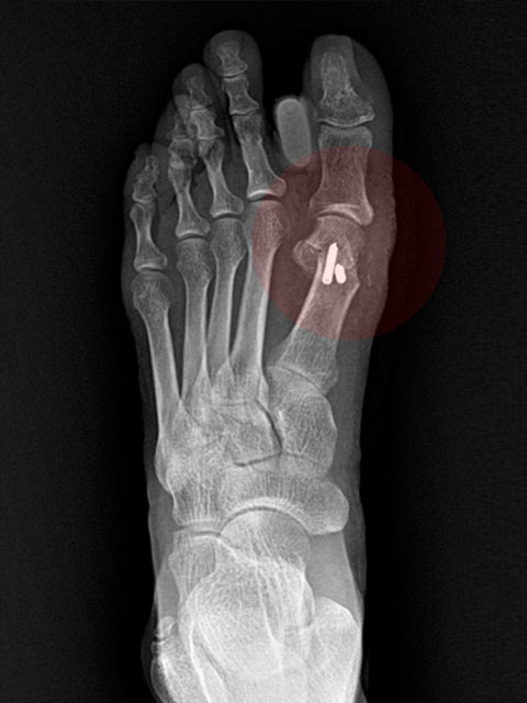 심하게 꺾였던 엄지발가락의 각도가 수술 후 일자로 교정된 상태
